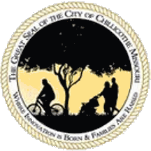 A white field, with the seal off-centered toward the upper fly, and the city name in shades of brown and gold below it. I found this flag at this page: http://www.waymarking.com/waymarks/WMK867_Municipal_Flag_Chillicothe_Mo. I don't know the date of adoption.