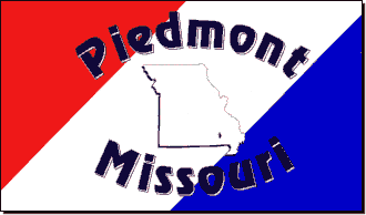 A red-white-blue diagonal tricolor with a map of Missouri and a spot indicating the town's location.  Arched above and below the map are PIEDMONT and MISSOURI.