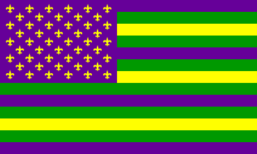 The purple/yellow/green triband with crown - which may appear either vertical or per bend sinister, & with the crown in either purple (usual) or green (rarely) - is indeed the MARDI GRAS celebration flag!!!! Mardi Gras (Shrove Tuesday) is celebrated - usually in New Orleans - before Lent.