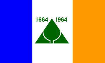 Vertically divided sky blue, white, and buff; in the middle stripe the Tercentennial logo (green triangle, point upwards, with two white lines reaching vertically up from the bottom broadening out in circular outlines) accompanied, next to the apex, by the years '1664' (left) and '1964' (right) in green.