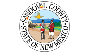 The Sandoval County flag was adopted in 1992 for the New Mexico capitol rotunda display. Sometime within the past 15 years a fully colored version started to be used at county offices, esp. the courthouse. The seal, in its outer ring, depicts the full county and state name, with a sunburst below each A. The inner circle depicts the encounter between cultures; a Spaniard with his rifle is to the lefthand side of an Indian holding a basket. At the very left are pioneers in a wagon being carried by oxen. In the background is the desert environment, a river, a bush, the mountains, sky, and a Zia sun symbol watching over.
