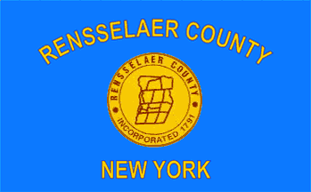 A light blue flag, with a central gold seal bearing a map of the county. The county name is arched above in yellow, and the state name below also in yellow.