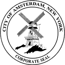 The flag as shown at www.gettysburgflag.com/images/Portfolio/City%20%26%20Town/AmsterdamWindmil2.JPG is yellow with a narrow vertical purple fly stripe. Toward the hoist is a large windmill, and the words One Community Many Cultures. Written downwards on the purple stripe is AMSTERDAM and at the bottom NY.