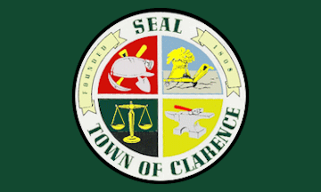 The flag for the town of Clarence, New York, consists of the seal centered on a dark green field, almost touching the edges.