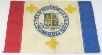 blue flag with the seal of New Rochelle. The flag also had three fleur-de-lis in