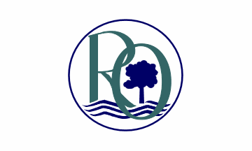 A white flag, with the village logo centered. The logo is a blue rimmed circle, filled white, with green letters R and O partly overprinted, the R standing on three wavy blue lines and in the O arising from the waves a blue tree. According to www.riverleaohio.com/news/yr2005/feb05.htm the logo was designed by Jane Neff Trucksis, curator of the Worthington Historical Society.