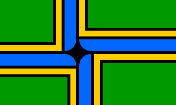 There is designated an official flag for the City to be known as the City Flag and described as follows: The standard size measures 5 feet in length by 3 feet in height. The background shall be green, symbolizing the forests and our green City. The design includes a four-pointed directional star, formed by the vertical and horizontal intersection of counterchanged blue stripes, symbolizing our rivers. The blue stripes are paralleled with yellow stripes, symbolizing agriculture and commerce. The yellow stripes are separated from the green background and the blue river stripes by white lines called fimbriations. The white central star is positioned slightly left of center, toward the staff end of the flag, called the hoist. (Ordinance 176874, amending Portland’s City Code Section 1.06.010.)