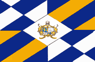 A banner of arms, quartered; first and fourth quarters a chequered pattern of blue and white, second and third quarters diagonal yellow and blue stripes. In center a white diamond bearing the coat of arms.
