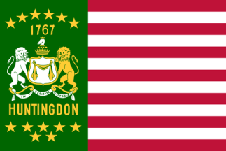 Image on a postcard located on eBay. Flag divided 1:2, green and striped 13 red and white stripes. On green stripe by hoist, the coat of arms, 6 gold stars and 1767 above, HUNTINGDON and 7 gold stars below.