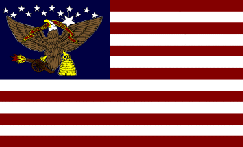 Utah was settled by Mormons and was made a territory in 1847. Since that time, a beehive has been one symbol (among others) used there. In 1851 the territory, under the name of Deseret, petitioned for admission to the union. They would not outlaw polygamy, and were turned down by Congress. Utah was admitted as a State in 1896. This flag was used apparently in 1851; at any rate, it appears in the Bellerophon Books coloring book entitled "American Flags to Color from Washington to Lincoln," which was authenticated by Whitney Smith.