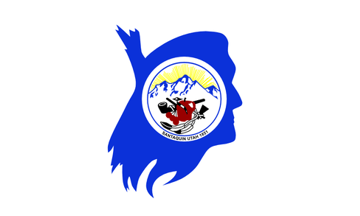 A flag described as the former flag of the City of Santaquin, Utah, is white with blue Santaquin silhouette faces right and seal-like emblem in the middle of the silhouette and of the flag. the emblem shows a sun, mountains, a pipe, a tomahawk, feathers, an apple, and cherries. In the outer circle is inscribed "SANTAQUIN UTAH 1851". Photo of the flag thanks to Benjamin Reeves, Santaquin City Manager.