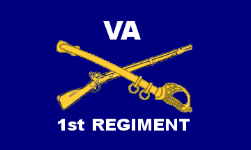 The flag of the 1st Regiment features a crossed sword and rifle in gold centered on a blue field. Above the sword and rifle are the capital letters "VA" in white for "Virginia," while below the sword and rifle are the words "1st REGIMENT."
