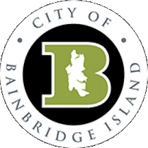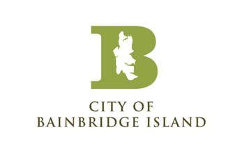 The city's flag can be seen in several photographs online, particularly at www.insidebainbidge.com. The flag appears to be the city seal centered on a white field. The seal itself is circular, showing a scene in blue and white of a ferry crossing Puget Sound, with mountains and trees in the background. The scene is surrounded by a thick blue circle containing the words "CITY OF" at the top and "BAINBRIDGE ISLAND" across the bottom, all in white capital letters. The only other color on the flag comes in the form of two red strawberries in the blue circle, separating the top words from the bottom.