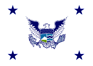 Here are FOTW standard images of the flags of the US Secretary and Deputy Secretary of Homeland Security. I have drawn them in the proportions (approximately 7:10) used for display aboard Coast Guard cutters. The Secretary of Homeland Security bears the same relationship to the Coast Guard as the Secretary of the Navy does to the US Navy and Marine Corps, so the flags of DHS officials are displayed by the USCG the same way those of Department of Defense officials are by the Navy. As shown in the photos posted by Dave Fowler, these flags also exist in an indoor/ceremonial form, in which they are trimmed with fringe matching the color of the stars and blue and white cord and tassels. The dimensions appear to be the same 52 x 66 inches (132 x 168 cm) used for the flags of senior officials of other departments.