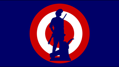 On it in white silhouette is a representation of the famous "Embattled Farmer" statue created by Daniel Chester French in 1874 that is in Concord, Massachusetts next to the North Bridge where the first battle of the American Revolution