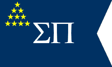 Sigma Pi was established as Tau Phi Delta at Vincennes University in Indiana in 1897. The flag shown on the fraternity's website is dark blue with a swallowtail, the Greek letters of the name in the center in white, and ten yellow stars arranged 1-2-3-4 in the upper hoist. Baird's Manual describes a different flag, lavender with the letters sigma and pi and the fraternity coat of arms.