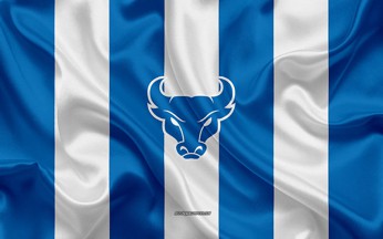 A photo of the flag is available at www.smbs.buffalo.edu/obgyn/images/studentpix/2004_class.jpg, which clearly shows it as a blue flag with the seal in white, and UNIVERSITY AT arched above it, and BUFFALO written below it. The seal can be also found at www.buffalo.edu/toolbox/vi_introduction.html: