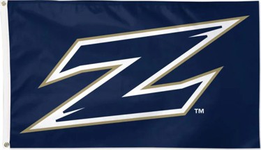 An institutional flag uses a white-edged gold A on a dark blue field. Other academic flags, shown below, use the university seal.