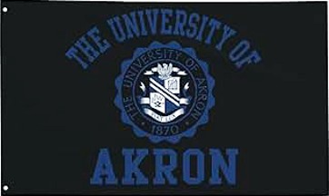 A presumably official flag of the University of Akron, located in Akron, Ohio, is the same shape as the Ohio state flag with a yellow border, white middle layer, and a blue core. By the hoist is the university seal in white.