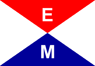 One of the last companies operating under sail. Flag divided per saltire, white in the hoist and fly, red in the upper quadrant and blue in the lower, with the letters E and M in white, arranged vertically.