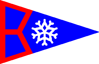 The newsletters also depict a separate burgee for Frostbiting -- winter racing, though apparently limited to soft water. The design is similar to the normal club burgee, but with the star replaced by a five-pointed crystal. Possibly this one doesn't exist in the cloth either, but I do like the design.
