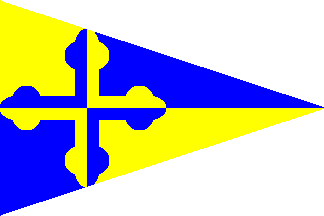 Its burgee is depicted as a ca. 4:7 triangle, quartered orange and black charged with a cross bottony counterchanged, all aligned on a line 5/12th of the hoist away from the hoist.