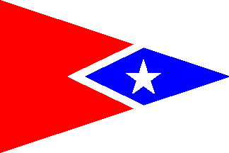 The distinguishing Club flag or burgee shall be a pointed pennant in width two-thirds of its length with a red field adjacent to the hoist and a blue field at the fly. The two fields shall be divided in the mid-section by a white chevron pointing toward the hoist. There shall be a white star in the corner of the blue field."