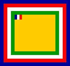 Almost square yellow flag bordered (from inside) green, white, red and blue, with a small tricolour in the canton of the yellow field.