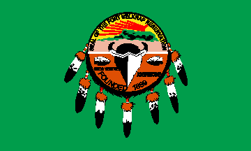 The flag used by these two Nations is green, a rare color in Native American flags, with the reservation seal in the center. The seal is formed by a traditional Indian shield which illustrates the protection of the two Nations in the past, present, and future from loss of tribal identity, culture, and land (Seal of the Fort Belknap Reservation, undated pamphlet). The shape of the shield refers to the circle of life, a frequent concept in Native American beliefs in which every thing in life depends upon every other thing. Seven red- white-and-black feathers hang from the shield. Six feathers stand for the twelve elected council members who represent the three districts of the reservation. The seventh and central feather stands for the tribal chairperson.