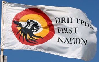 The flag of Driftpile Cree Nation consists of the Nation's emblem on the white background, positioned towards the hoist, and black lettering "DRIFTPILE / FIRST / NATION" on the rest of the flag. It can be seen on a photo at: www.driftpilecreenation.com