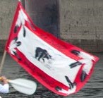 A version of the flag shows the bear and mountain logo centered with a wide red border, bearing three feathers in each corner.