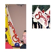 The flag is a white field with the band's name in red, centred. Image above based on this photograph.