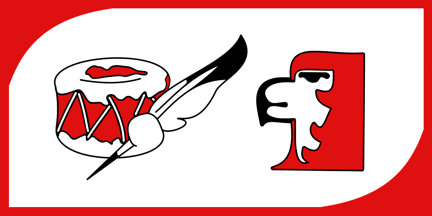 The flag is white, bordered red, with the border wider around the upper hoist and lower fly. On the white field is a drum and feather toward the fly, and a stylized eagle head toward the fly.