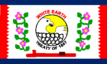 The elaborate flag of the White Earth flies proudly outside their casino and their tribal center (Letter, Barb Nelson, Public Relations Officer, 17 Jan. 1995). The flag has many elements on a white field (photo provided by the White Earth Band of Chippewa). At top and bottom are narrow stripes in blue, the traditional color for the sky and for water. The left and right sides have serrated borders in red, the color of the people themselves. In the center a yellow disk represents the sun. Overlying the sun is a white bust of the bald eagle, Migizi, the most revered animal in the Ojibwe culture. Arching above the sun and eagle is "WHITE EARTH", below is "TREATY OF 1867".