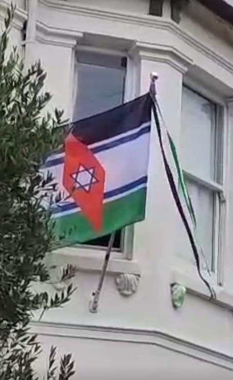 The image is flipped horizontally and cropped from this photo: https://commons.wikimedia.org/wiki/File:Israel_palestine_flag.jpg which was taken at the protest against the Basic Law: Israel as the Nation-State of the Jewish People, which took place in Tel Aviv, 2018-08-11. The flag is clearly an expression of disagreement with the idea of explicit definition of Israel as a Jewish state (current Basic Laws say nothing in that regard), due to fears that it would only worsen the situation, in Israel as well as in the wider region.