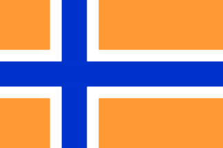 Bravoland is a "cyber-state" created in 2007 with the intention to provide a "cyber-homeland" for the Afrikaner/Boer people. Its flag, called the Triomfvlag (Triumph Flag in Afrikaans) is orange, with a blue Scandinavian-type cross bordered white. Unlike the "state" it represents, the flag is not virtual at all, and copies are used in real life which have been photographed many times so far as can be seen here, here and here.