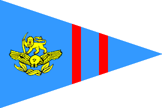 A triangular pennant of light blue with the air force badge in yellow.  The pennant is bordered by a red stripe, with a horizontal stripe across the centre which is intersected by the badge.