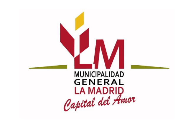 The flag of General La Madrid is white with a maroon LM graphic, under which is written in three lines MUNICIPALIDAD GENERAL (in black) LA MADRID (in maroon) and in a script format below that Capital del Amor in maroon.