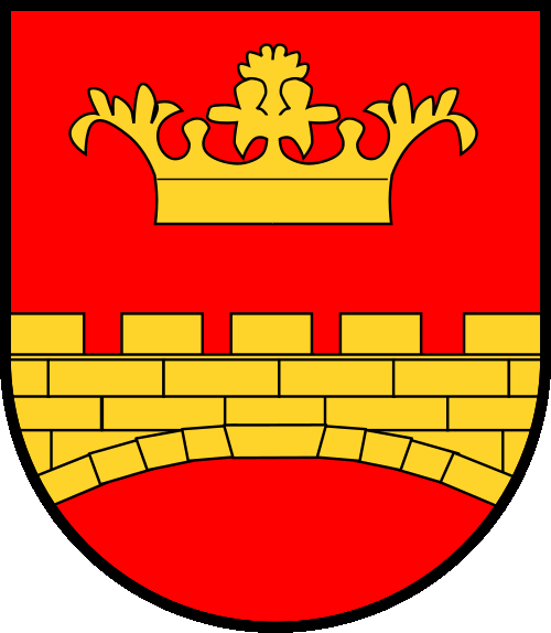 From the communal website: "In a red shield, a golden masoned bridge with five crennelations, surmounted by a golden crown of leaves.