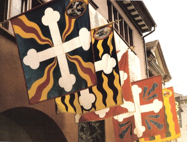 The Rhodes flags as military unit flags have been documented since the 17th century. Some flags show religious images on the obverse, and the arms of their Rhode on the reverse (mostly in the upper hoist canton). The flags are traditionally presented at the annual Landsgemeinde and the Corpus Christi procession.