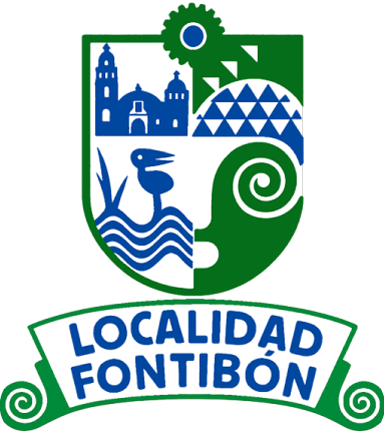 The symbol of Fontibón was built from the concept of what the word Fontibón signifies (powerful captain), determining a unity with the magic character of a pre-Colombian mask, asymmetrically composed but equilibrated in a heraldic format (according to Spanish norms), divided into four parts, in which are found the representative signs of the aforementioned locality, with text in the lower part which gives sustainability to the heraldry [over a ribbon reading LOCALIDAD FONTIBÓN].