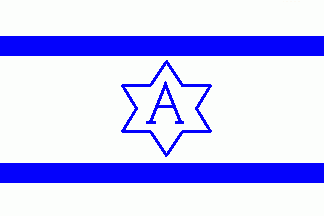 The white flag was parted by two horizontal blue stripes. Between the stripes on its centre was a white 6-point star fimbriated blue charged with a blue serifed initial "A".