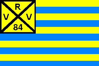 It was a 10-stripes flag, horizontally parted by alternating yellow and blue stripes. The yellow canton had a thin black bordure and was parted by black saltire with black inscriptions on every quarter as follows: "R"(top), "V"(hoist and fly) and "84"(bottom).