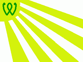 Its first ephemeral flag had been white. On upper hoist quarter was a part of a yellowish green disc charged with a W-shaped green knot. From disc emerged five yellowish green rays to the edges of the flag.