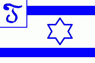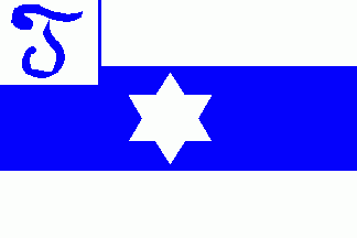 The flag was white. Shifted to fly was a voided blue 6-point star between two horizontal blue stripes. The white canton was separated from the rest by two blue lines and chargesd with a blue stylised initial "T".