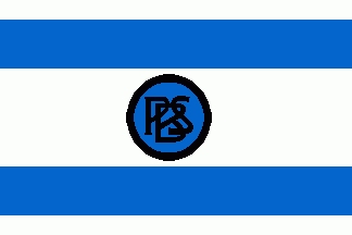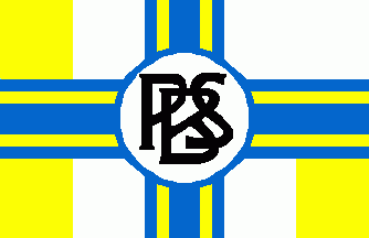 The flag was white with the logo of the club, intertwined stylised black initials "PBS" on a dark blue disc fimbriated black,