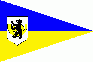 It was a blue flag divided by a yellow saltire. In the centre is a white shield with a blue rampant bear above a blue horn.