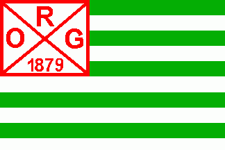 The flag was parted by ten horizontal stripes alternating of green and white. Six stripes at hoist were covered by a white canton with red edges, parted by a red saltire with red inscriptions "O" (hoist) "R" (top) "G" (fly) and "1879" (bottom).