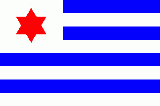 The white flag is divided by two blue horizontal lines. In the centre between the lines is a white 6-point star in a blue disc.