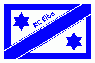 The flag was white with blue rectangle cotized blue white nearly filling the whole flag. Over all was a blue bend sinister cotized blue white. In upper hoist corner and lower fly corner of the rectangle ere blue 6-point stars. Alongside the upper edge of the bend sinister was a blue inscription "RC Elbe".